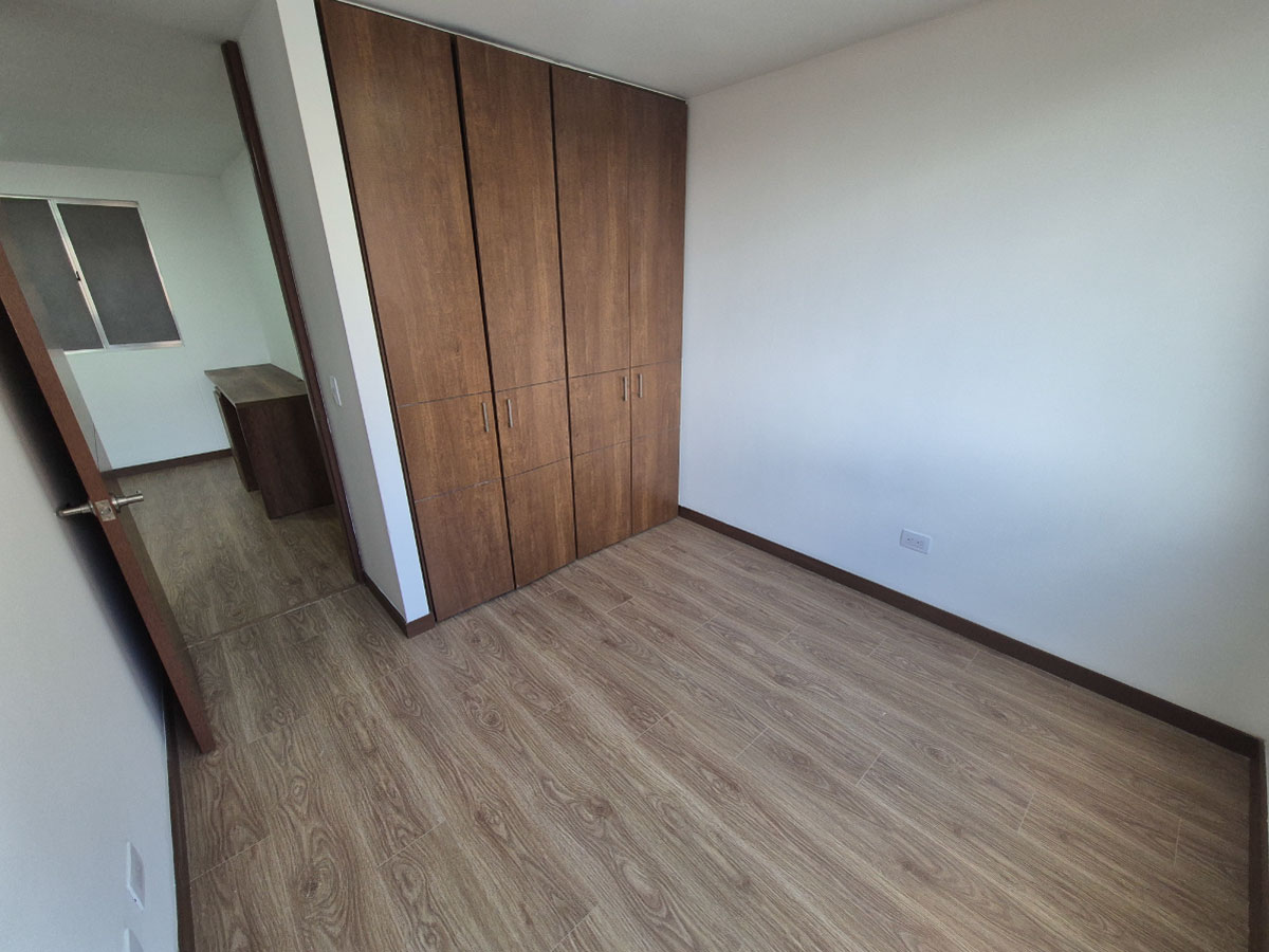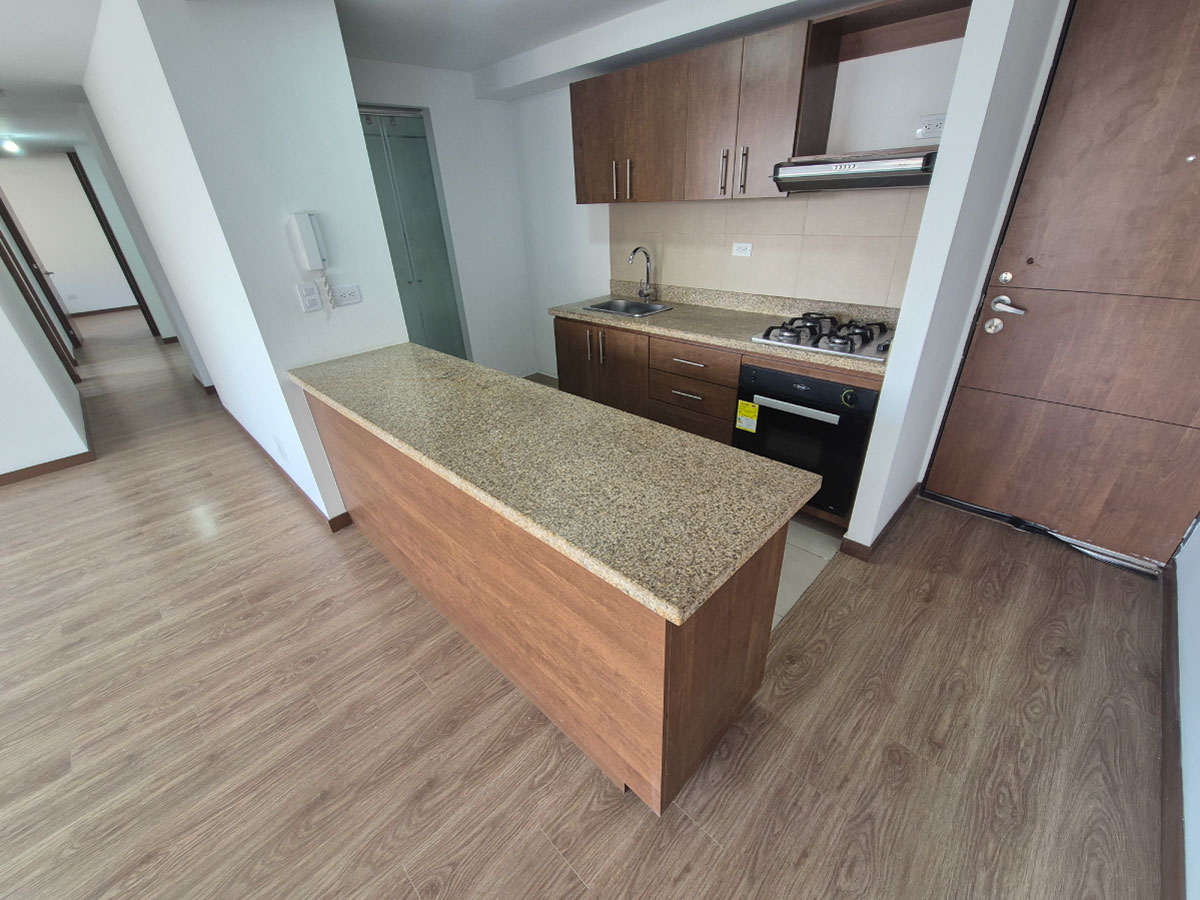 Apartamento en venta de 83m2, con vista interior, ubicado en un 3er piso, acceso por ascensor, parqueadero propio descubierto, depósito. Consta de 3 habitaciones, 3 baños, sala comedor, cocina integral y zona de lavandería. Tiene piso laminado en habitaciones y zona social y piso cerámico en baños y cocina. El conjunto tiene zonas verdes, zonas para niños, zonas húmedas, squash, salón múltiple, supermercado, salón comunal, zona BBQ y vigilancia privada las 24 horas.